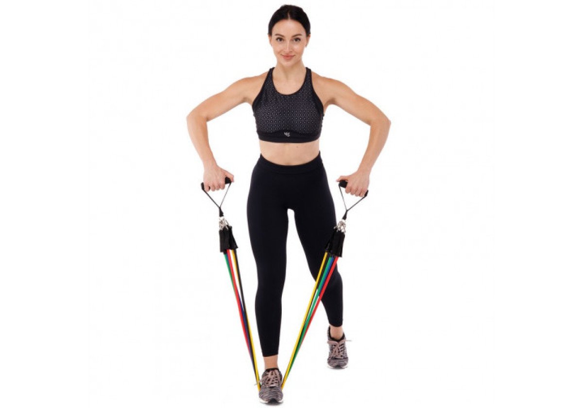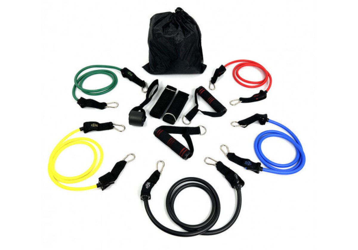 Комплект еспандерів Бубновського EasyFit являти собою 5 гумових джгутів різного опору. Такий набір дозволить регулювати навантаження під час занять та збільшувати ефективність тренувань, чергуючи чи комплектуючи еспандери різного опору, що дозволяє виконувати весь комплекс вправ за програмою тренувань Бубновського з еспандерами. Ручки виконані з високоякісного пластику і вкриті уретановою фіброю в місці хвата, на кінцях встановлені півкільця. Кожен універсальний еспандер-джгут оснащений металевим карабіном для кріплення до півкільця на ручках або кріплення. У набір входить зручне кріплення на двері, що дозволяє тренуватись у будь-якому зручному приміщенні. Тренування ніг із універсальними еспандерами Бубновського виконується з використанням манжет (2 шт. у комплекті). Набір еспандерів Бубновського EasyFit укомплектований нейлоновою сумочкою, що забезпечує зручне зберігання та транспортування інвентарю.