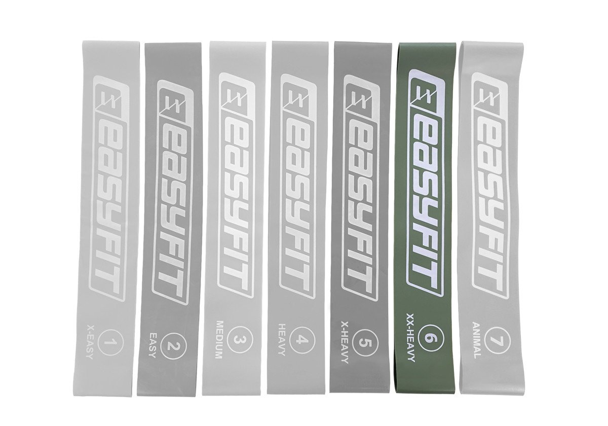 Фітнес-кільце EasyFit №6 - це резинка з рівнем навантаження XX-Heаvy, яка має підвищений опір та підійде для складного рівня навантаження. Основна перевага фітнес резинок для спорту полягає в тому, що вони створюють напругу по всій амплітуді руху та можуть бути використані у тренуваннях різних частин тіла. Гумові петлі EasyFit виконані у вигляді замкнутої смуги із міцного латексу, що обмежує рухи, роблячи їх складнішими. Під час тренувань із фітнес-кільцями акцент робиться не на швидкість, а на правильну техніку виконання. Навіть прості вправи, такі як присідання, випади та махи ногами, з використанням кільцевих гумових петель ефективно проробляють м'язи сідниць, тазу та стегон.