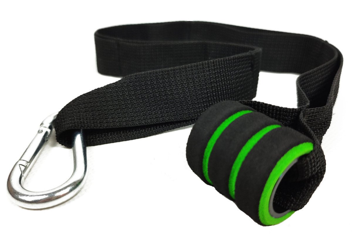 За допомогою карабіна розімкнутий еспандер можна закільцювати і використовувати як звичайну гуму для підтягувань на турніку або для віджимань на брусах.