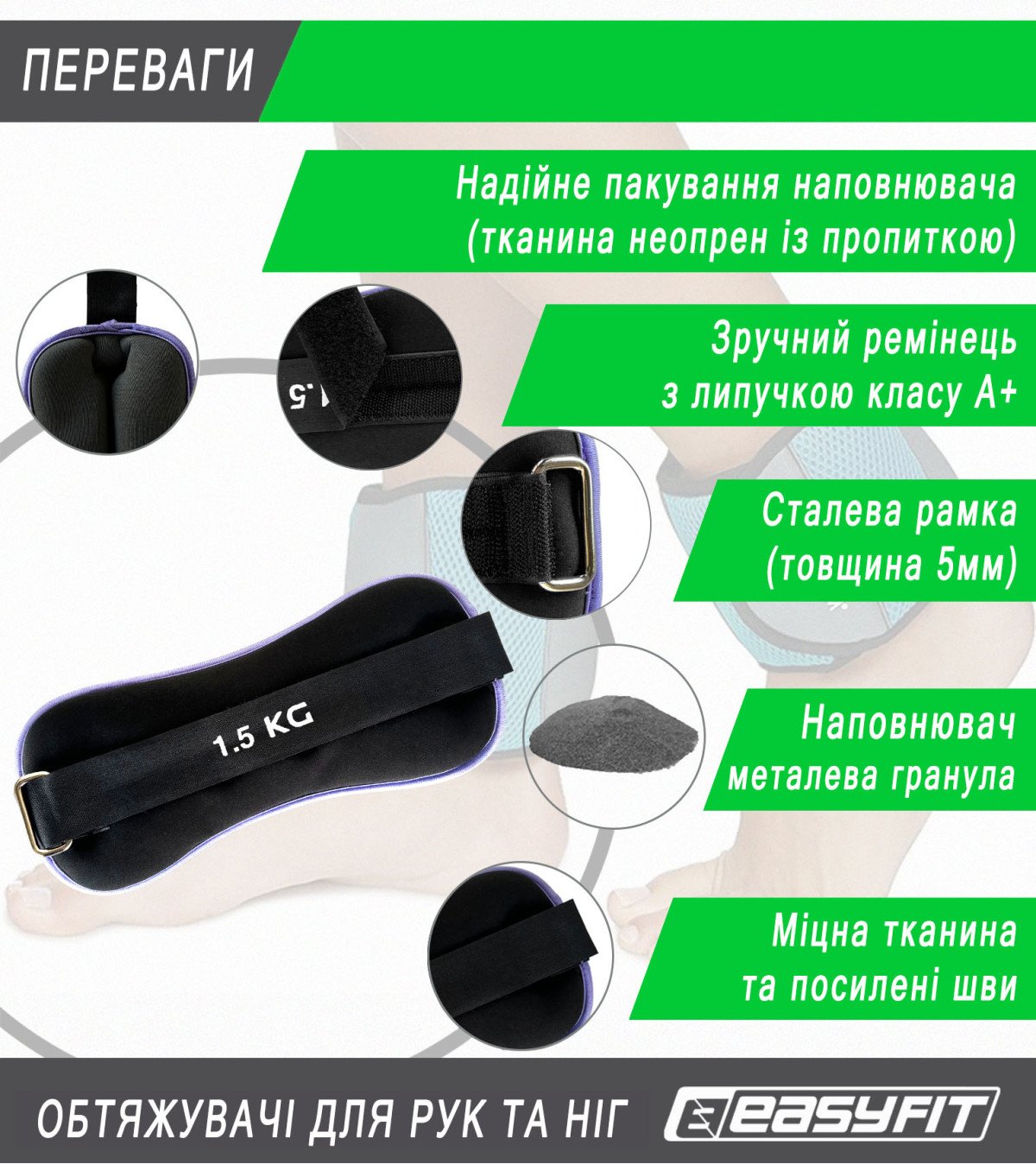 Надійність та довговічність: Використання сталевих гранул в обтяжувачах EasyFit Comfort, укладених у просочену тканину, гарантує їхню довговічність та стійкість до механічних впливів. Ця конструкція запобігає розривам і витоку наповнювача, що робить обтяжувачі надійними і довговічними, придатними для будь-яких тренувань.